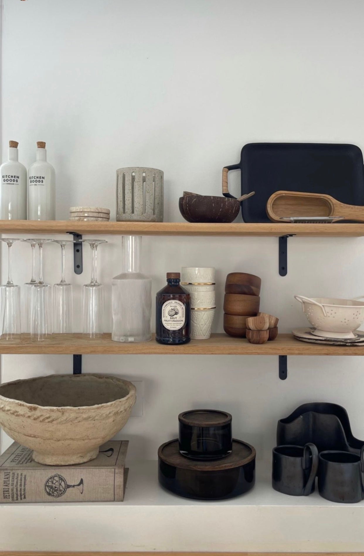 Autre exemple, si tu as des étagères ouvertes, tu peux créer des compositions qui mettront en valeurs les plus jolies éléments dont tu disposes (mugs, verres, bouteilles, plateau à œufs...).