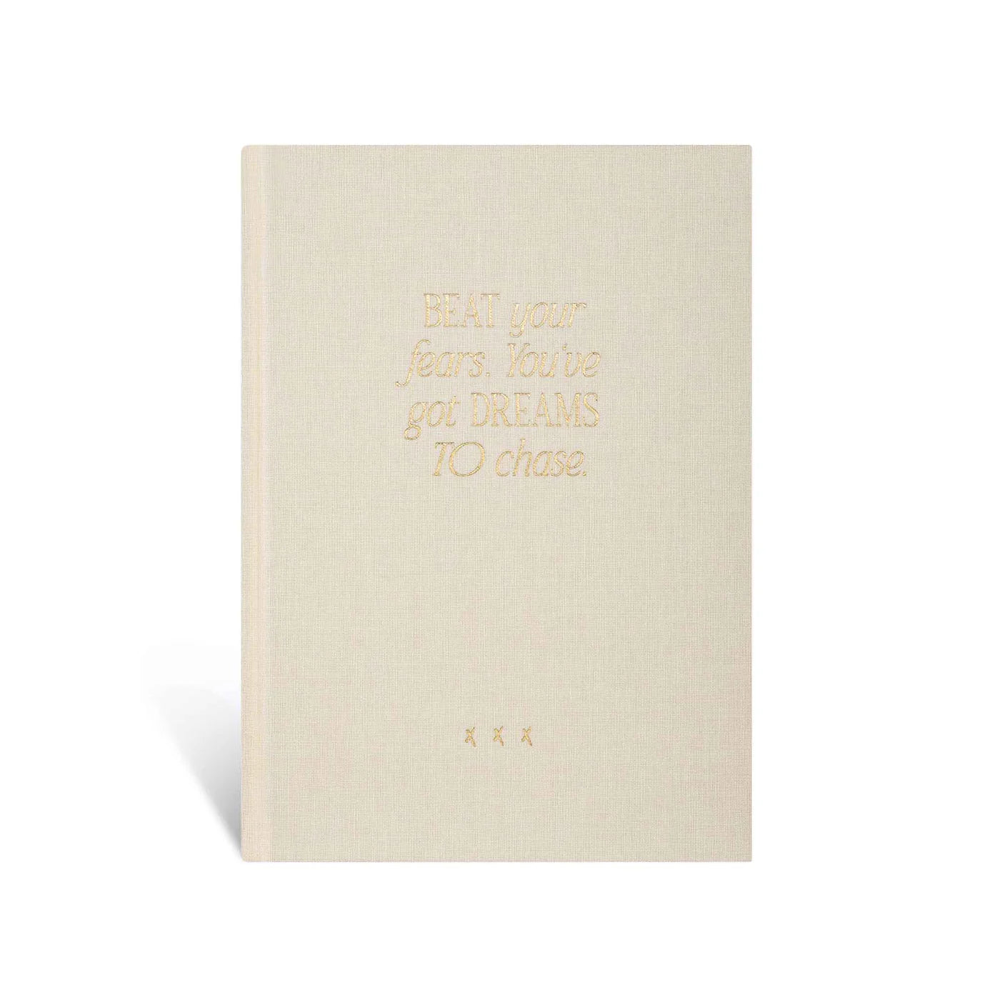 La couverture en lin blanc cassé de haute qualité avec une dorure à chaud noire estampillée « Battez vos peurs, vous avez des rêves à poursuivre » sur la couverture vous rappelle qu'il est temps de surmonter vos peurs et de poursuivre vos rêves.