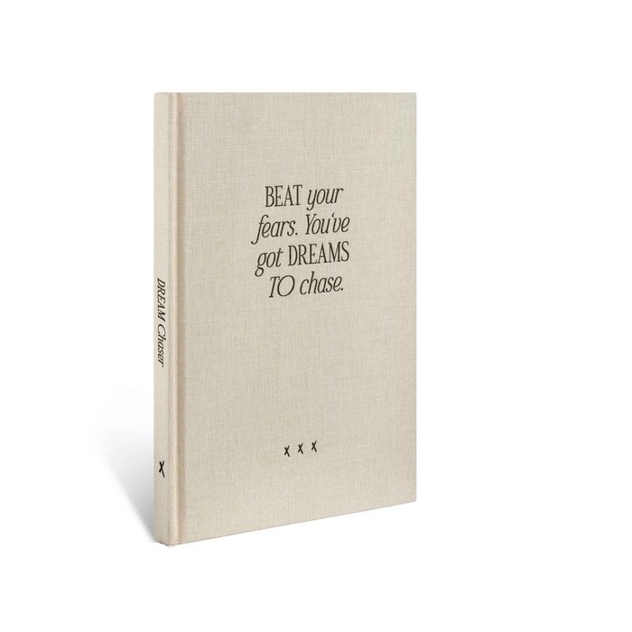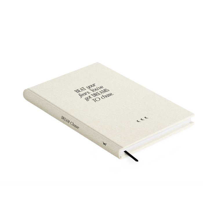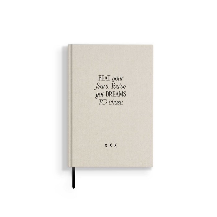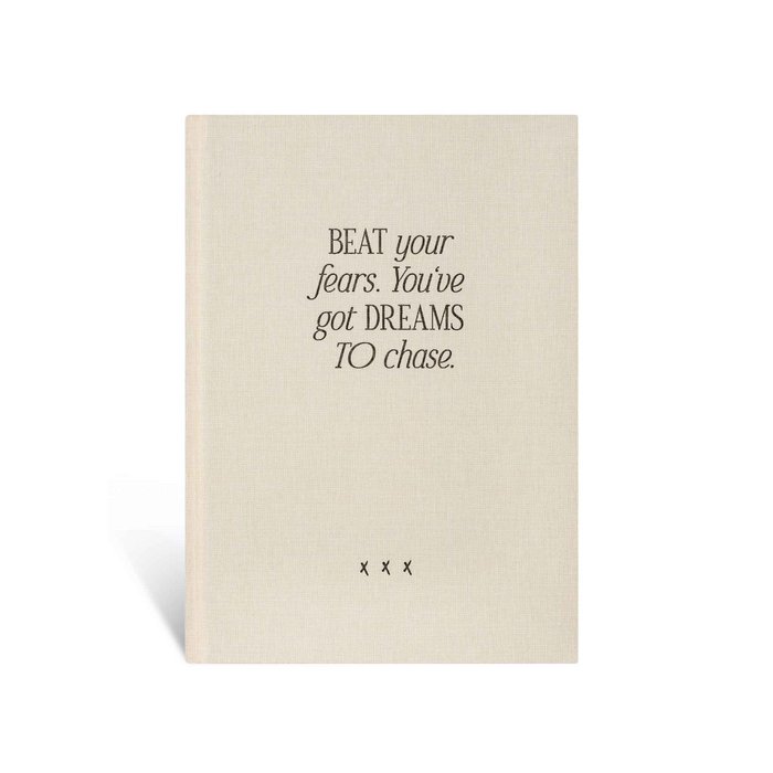 La couverture en lin blanc cassé de haute qualité avec une dorure à chaud noire estampillée « Battez vos peurs, vous avez des rêves à poursuivre » sur la couverture vous rappelle qu'il est temps de surmonter vos peurs et de poursuivre vos rêves.