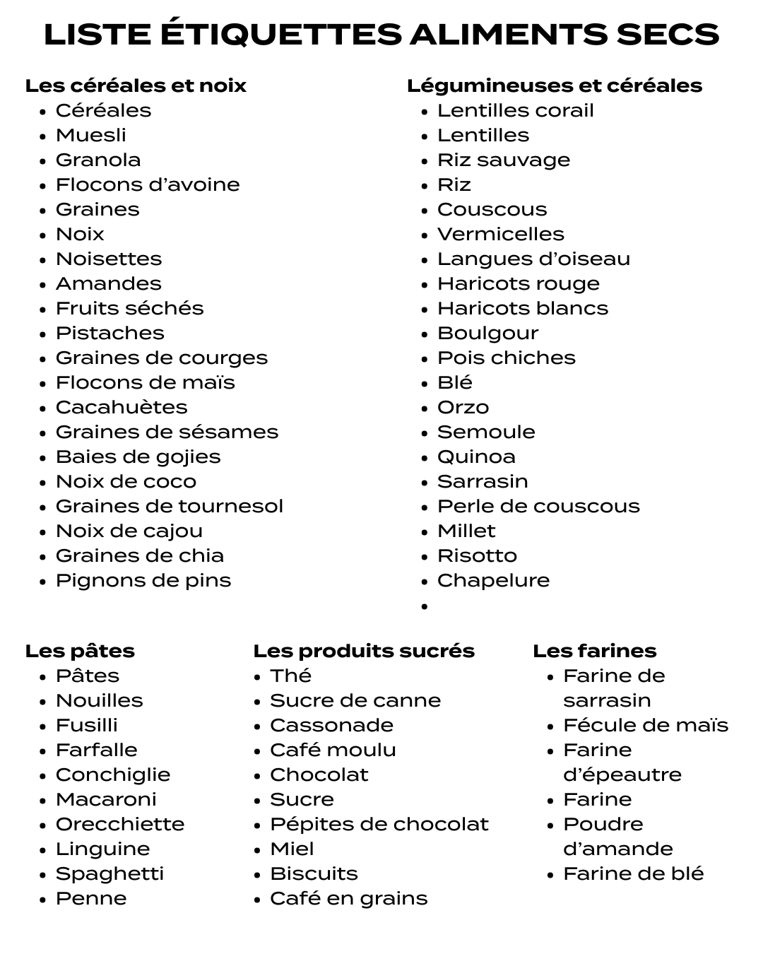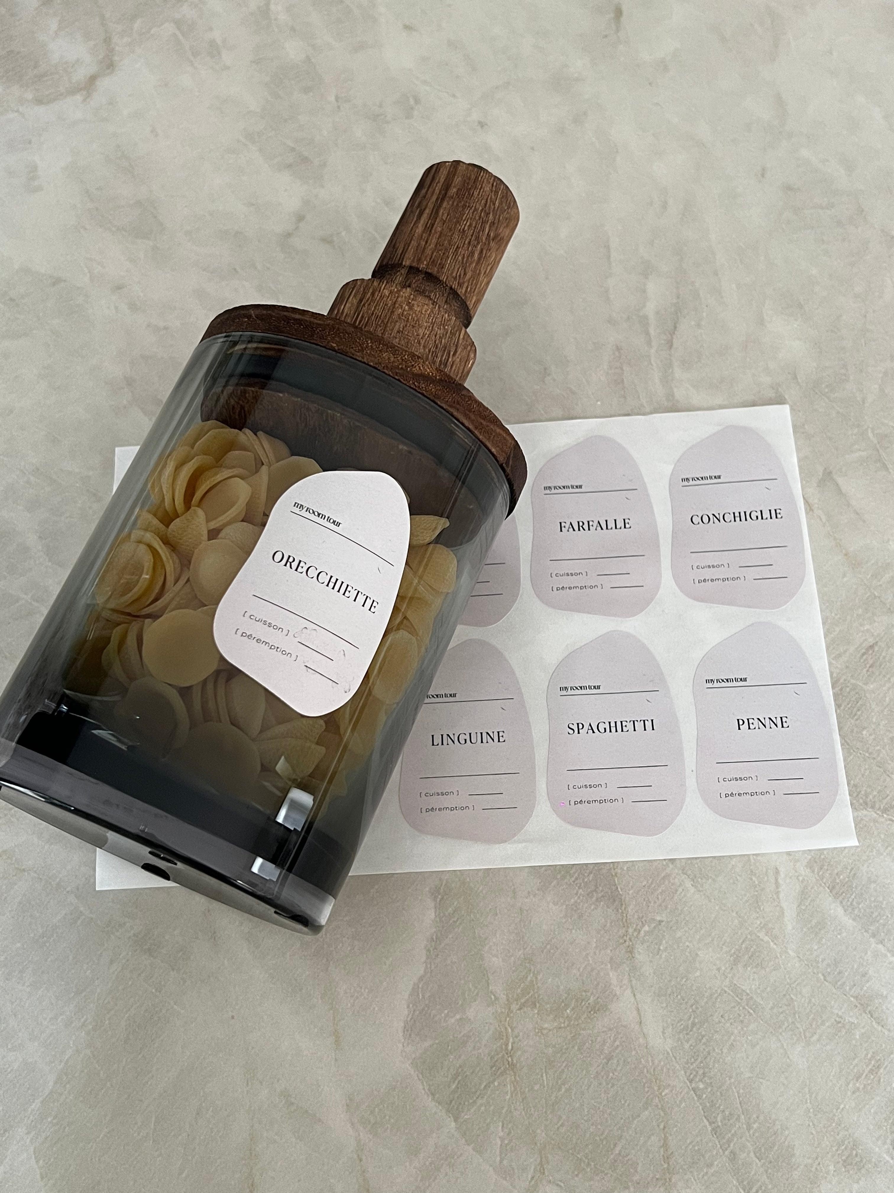 Usage : Pots à épices, bocaux d'aliments secs (pâtes, céréales, flocons d'avoine, noix, légumineuses...)