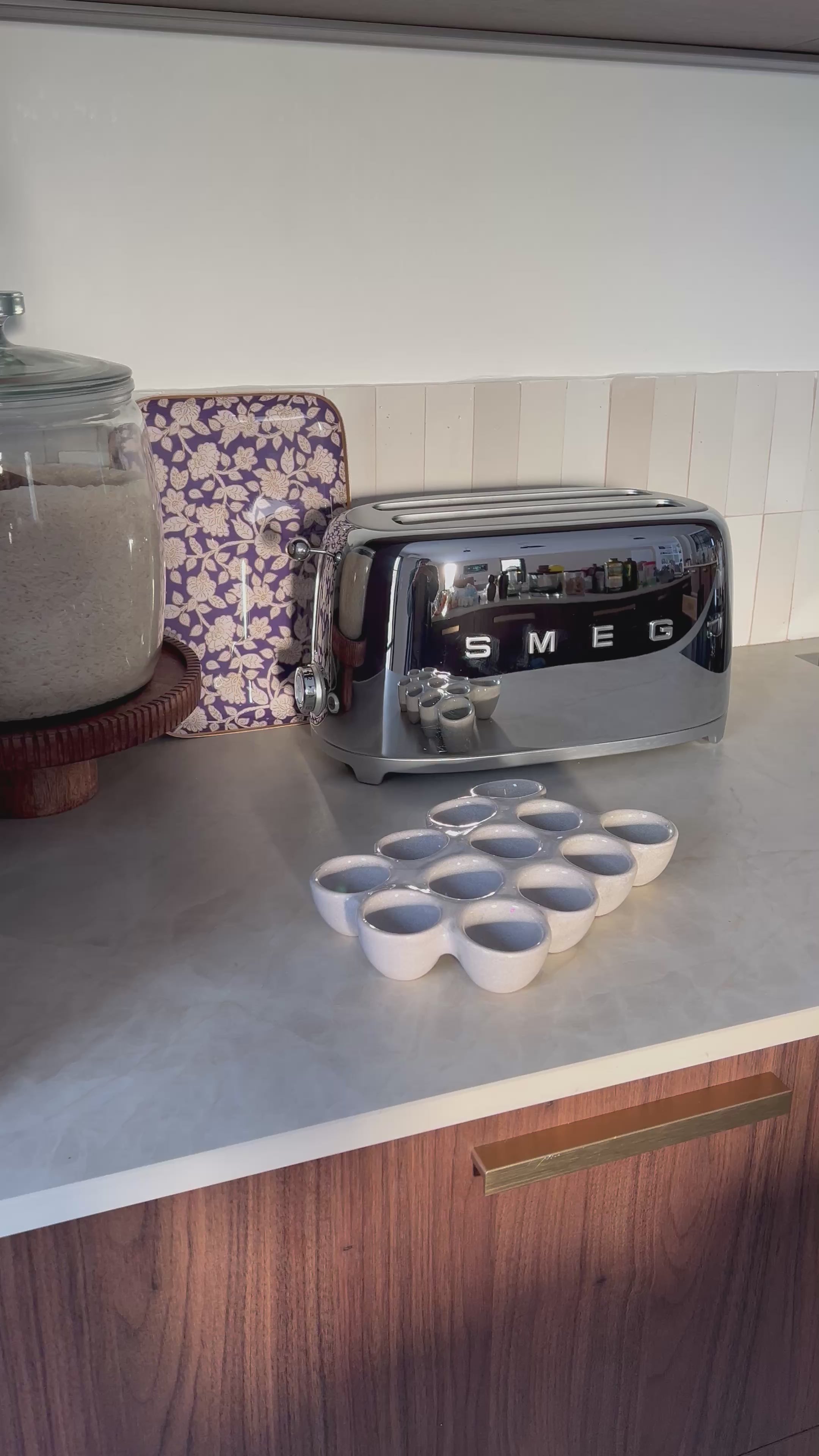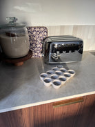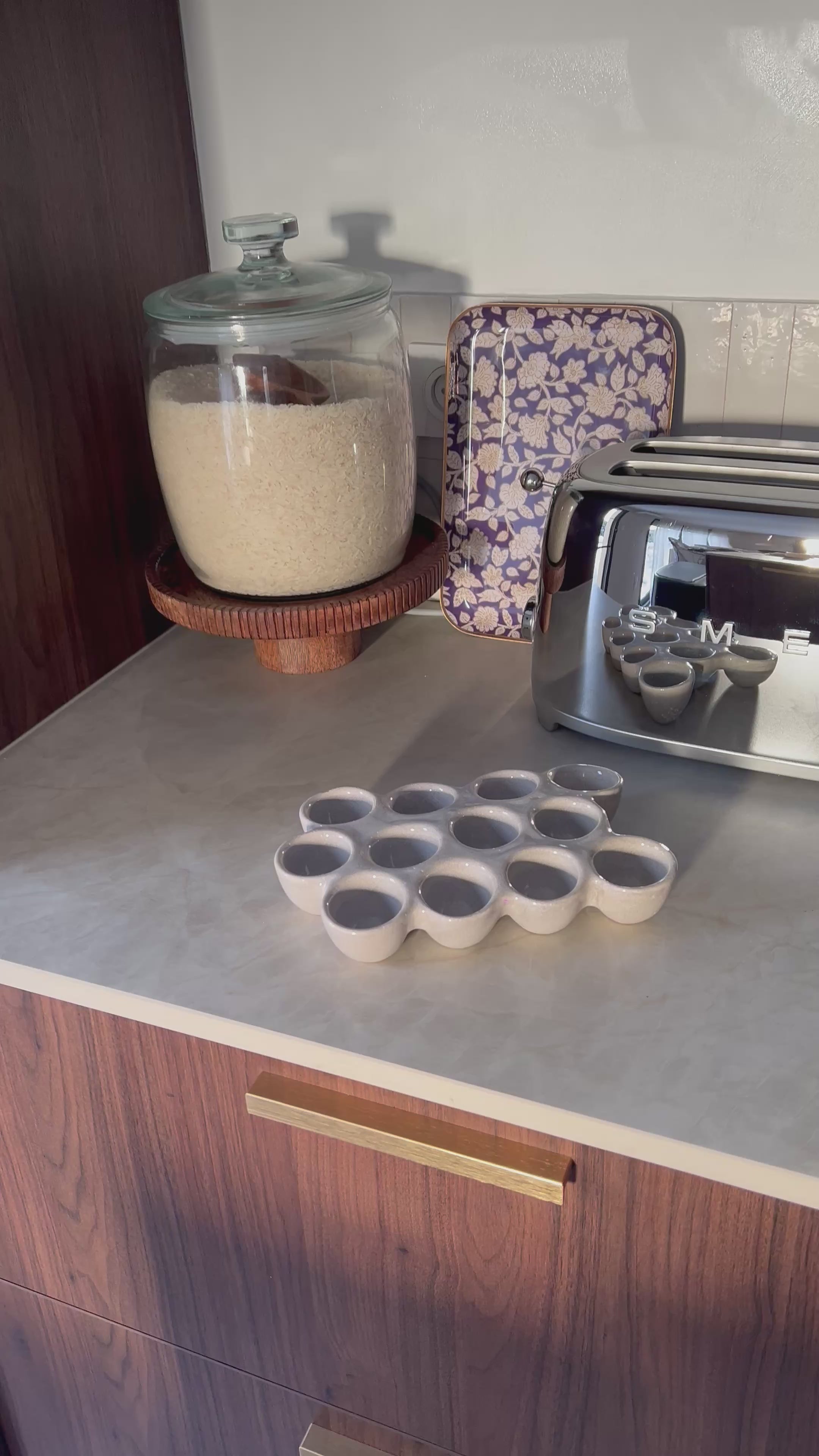 Une architecture sculptural qui fait statement Le Trophée à Oeufs ne se cache pas : il s'expose. Sa structure verticale et son jeu de volumes créent une présence visuelle forte qui capte immédiatement l'attention. Contrairement aux supports traditionnels qui cherchent la discrétion, cette pièce assume pleinement sa fonction décorative. Les lignes épurées et la composition étudiée en font un véritable objet d'art fonctionnel qui enrichit l'esthétique globale de votre cuisine.