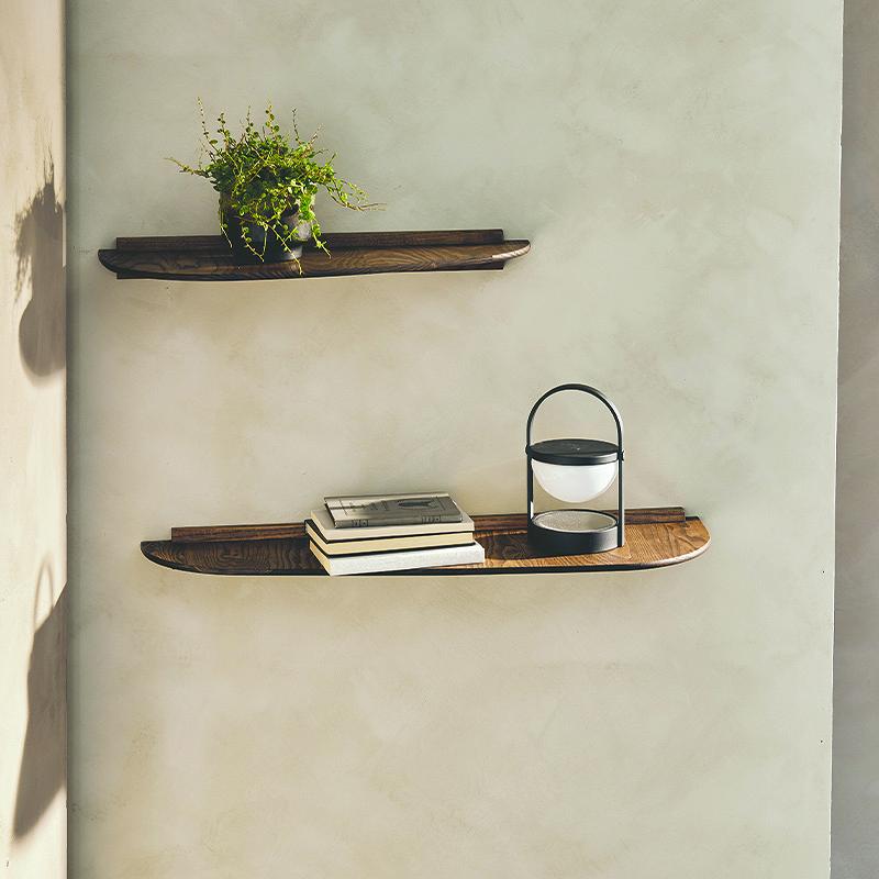 Des étagères fonctionnelles conçues pour avoir un visuel flottant et léger et offrant de l'espace à la fois pour le rangement et la décoration.